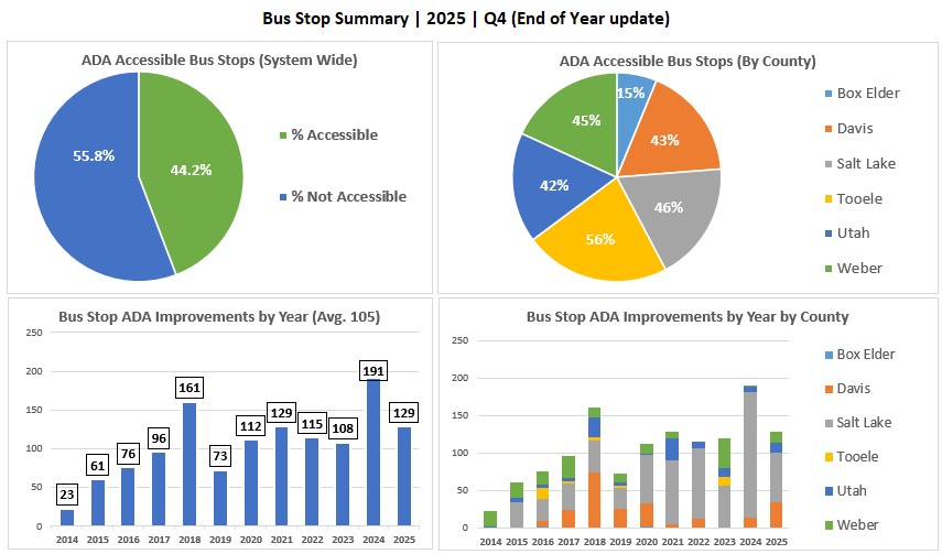 UTA will improve and build over 100 bus stops across the Wasatch Front over the next several months, including in Weber, Davis, Salt Lake, and Utah counties. Work began in September 2024 and will continue through March 2025.