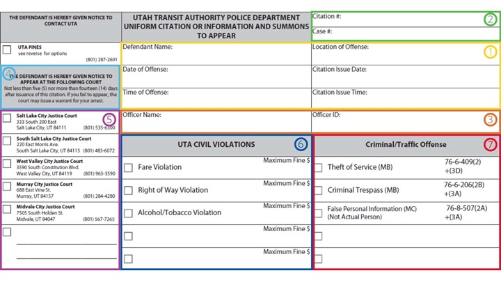 • UTA Civil Violations: These are non‑criminal violations handled by UTA’s internal process. Please call 801‑287‑2601 if you have questions or need assistance.